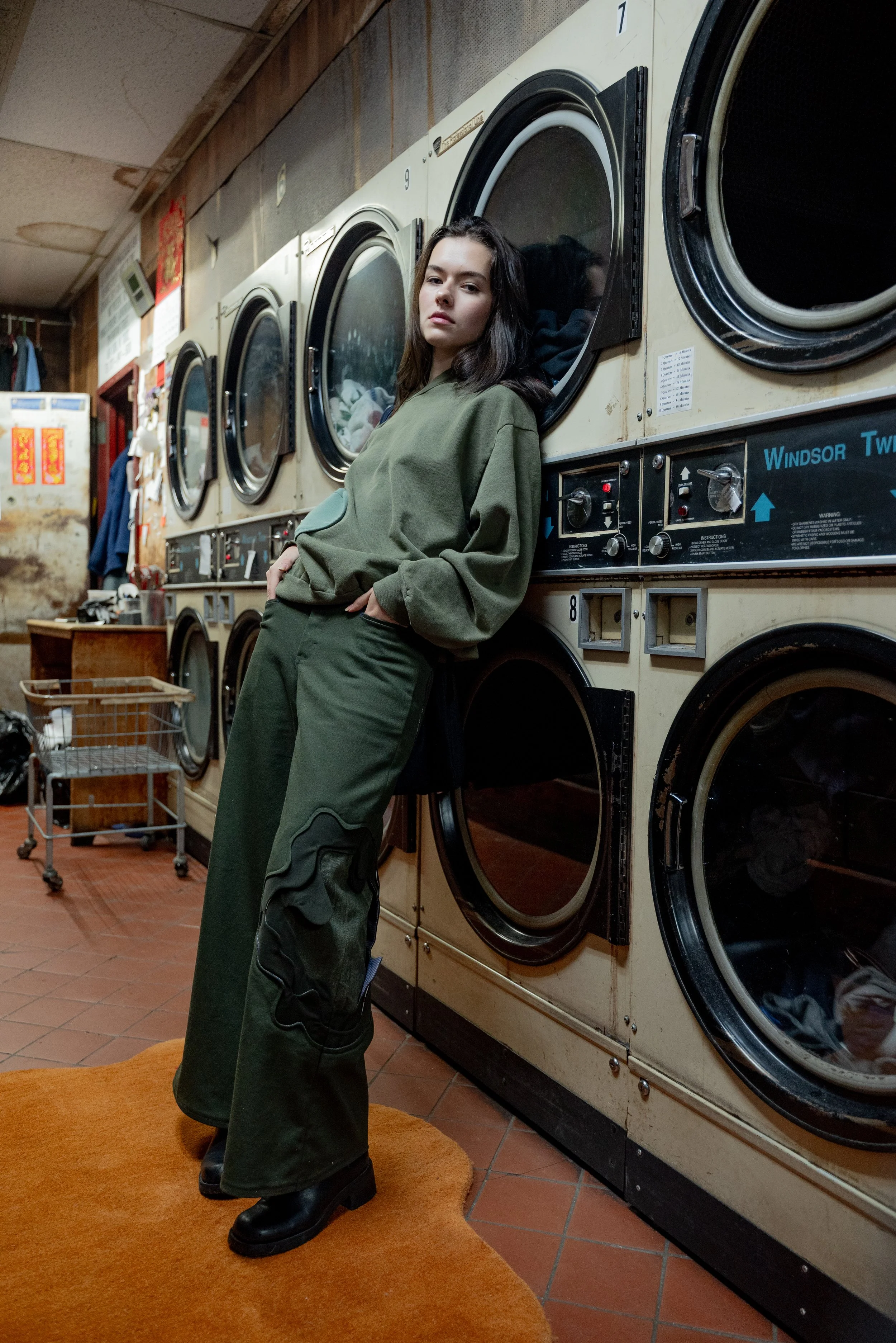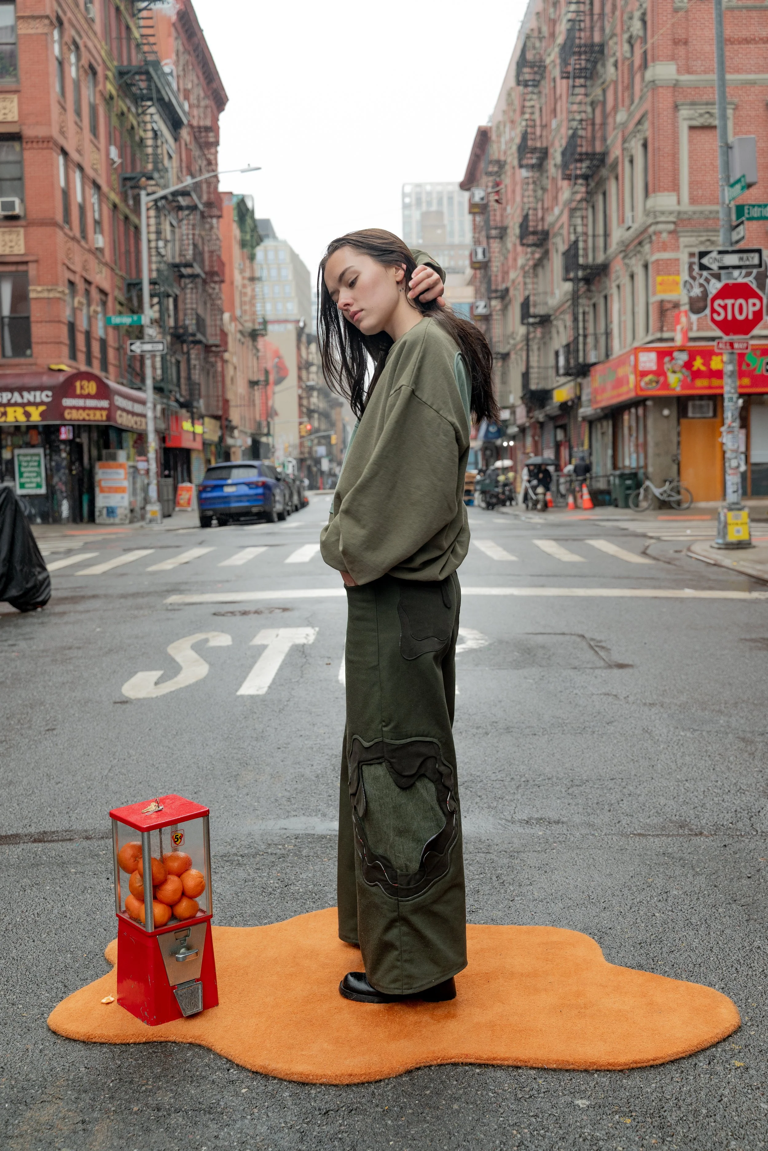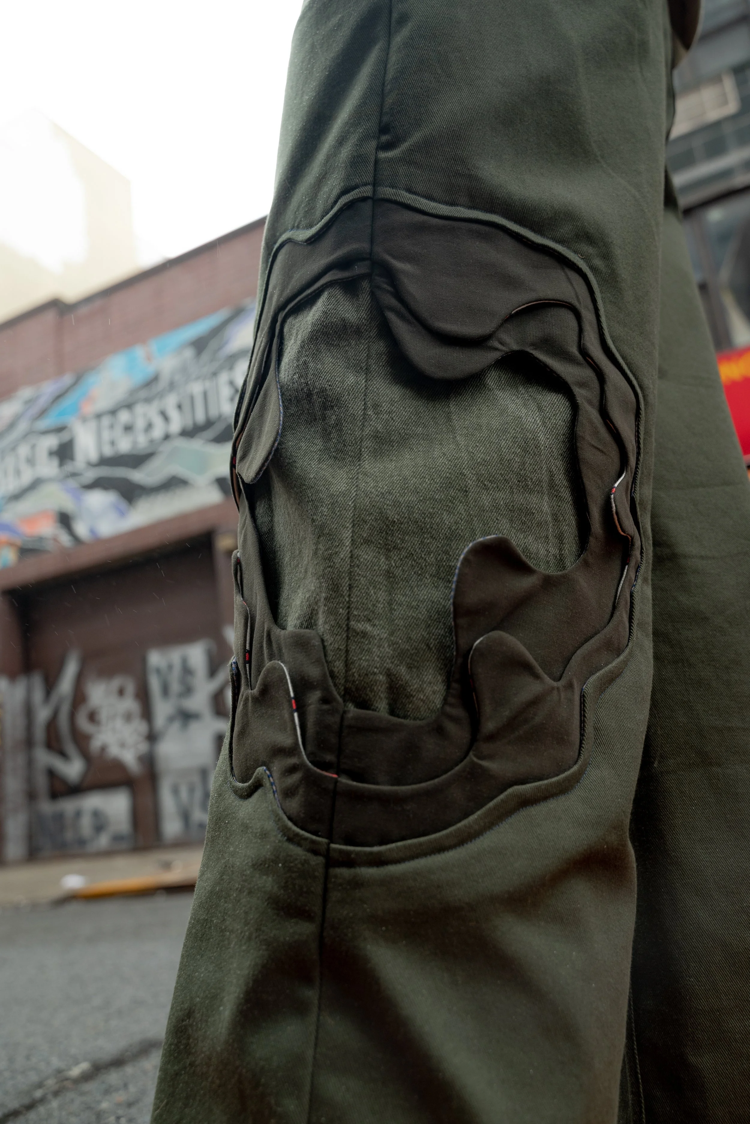 Cut-and-sew straight leg pants with topography, amoeba detailing on the left legGreen cotton and denim
