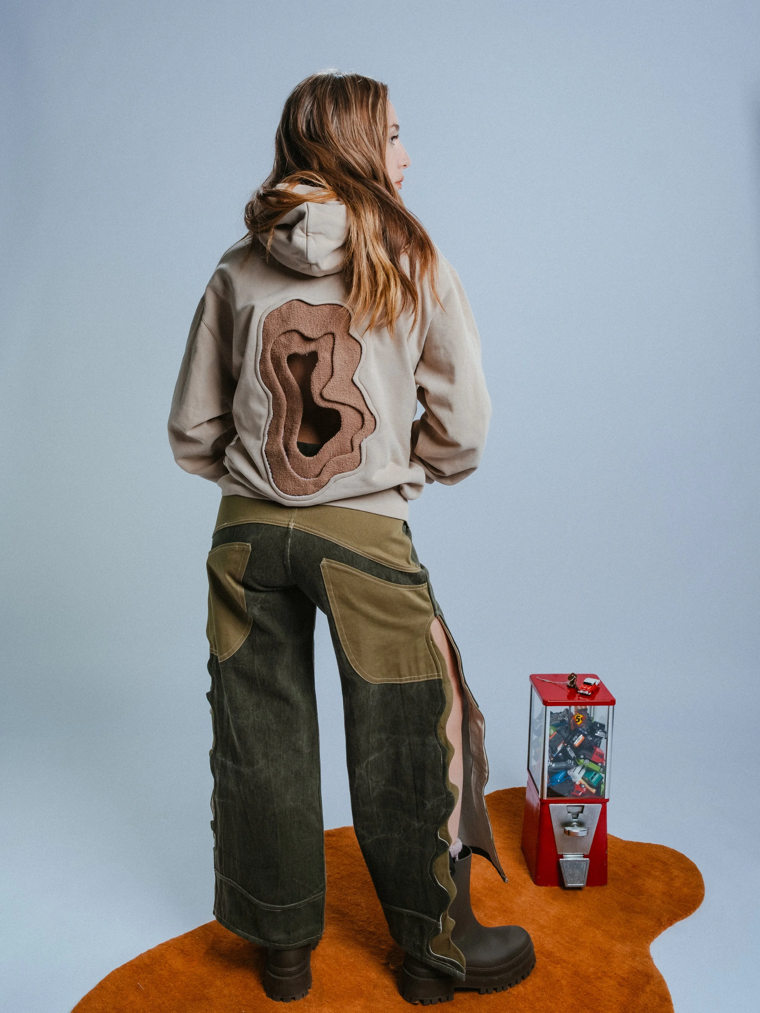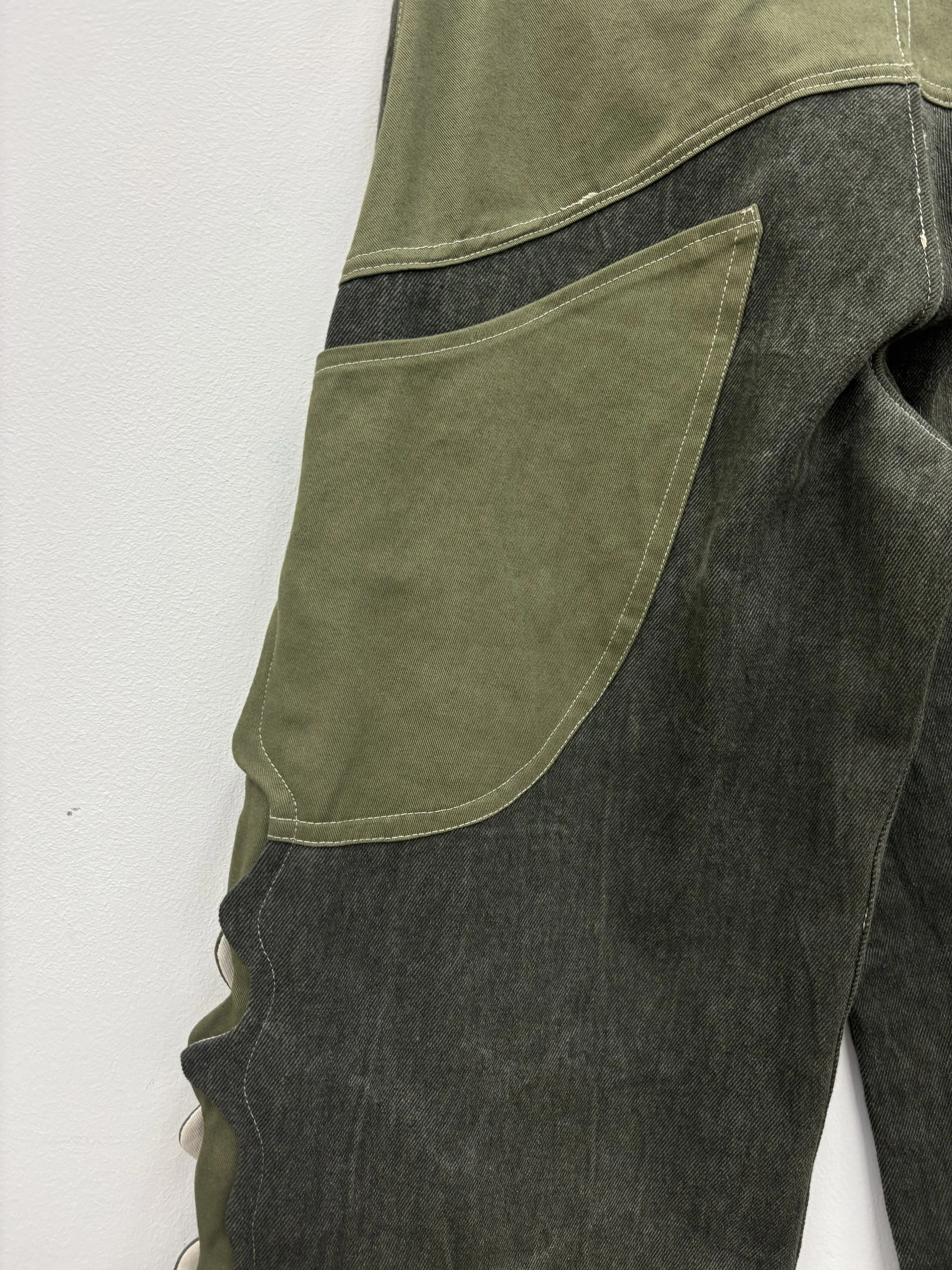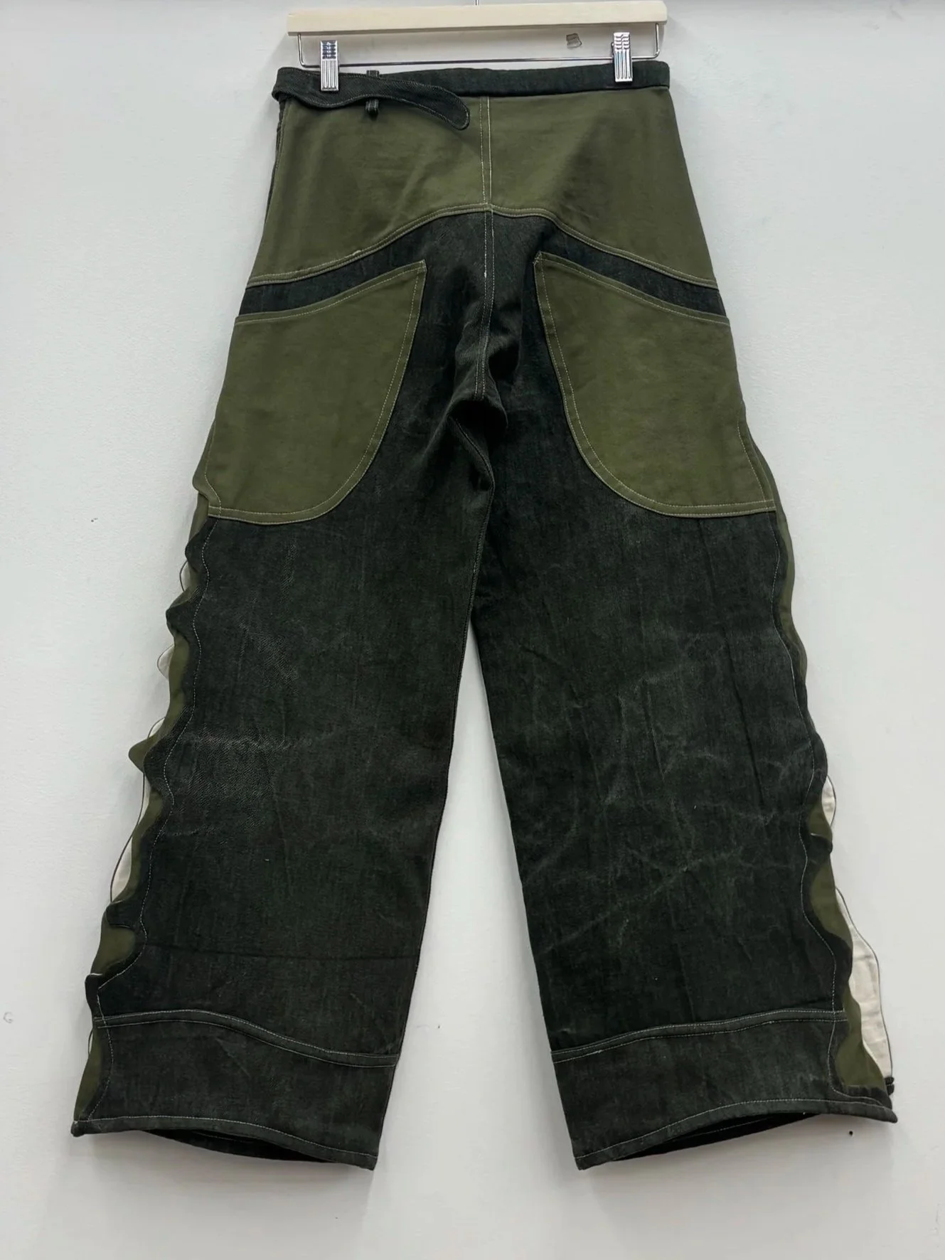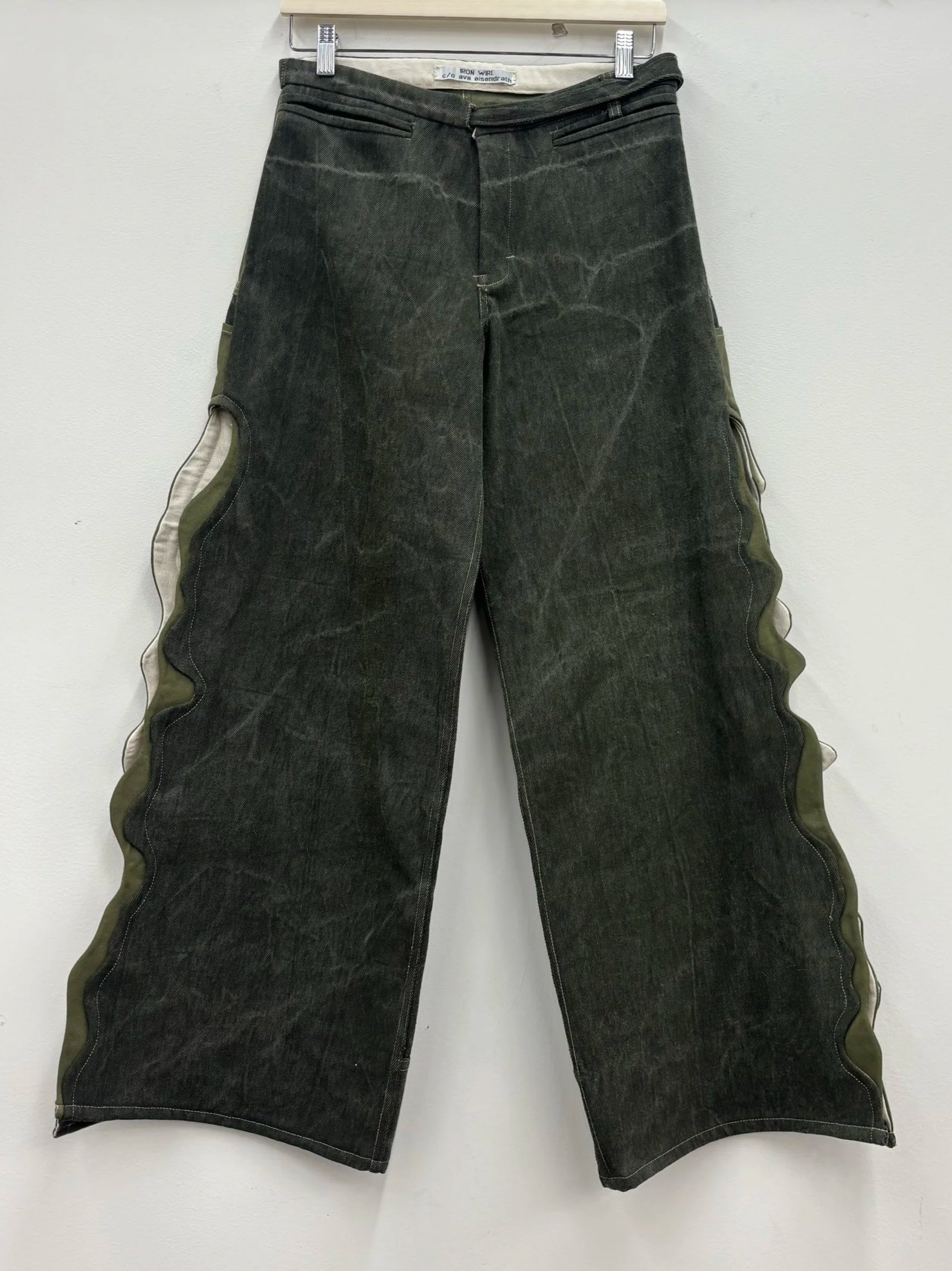 Cut-and-sew pants with topography-esque slits down the side of both legs
