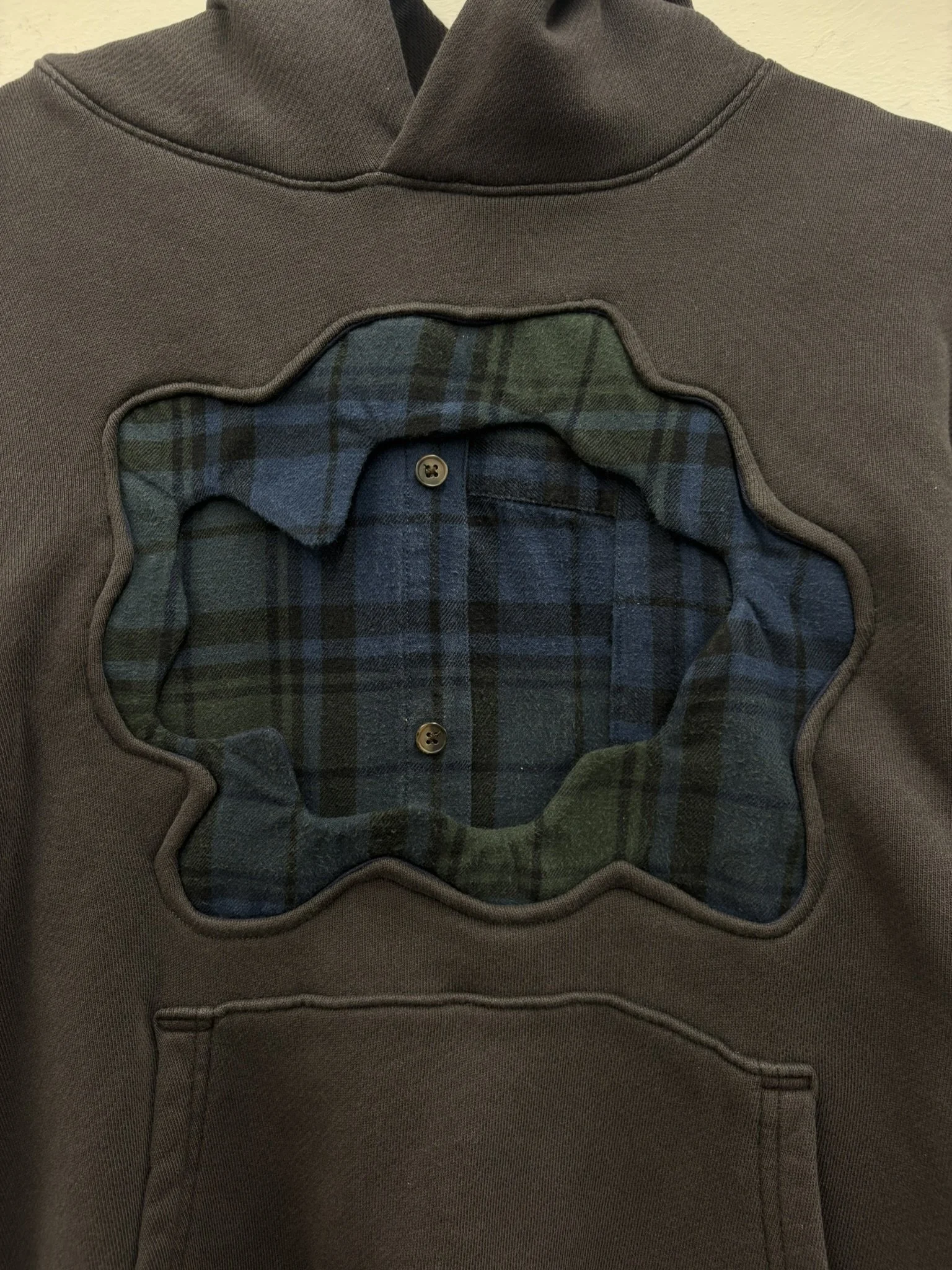 Brown hoodie with plaid detailing on the collar and a plaid tie on the back