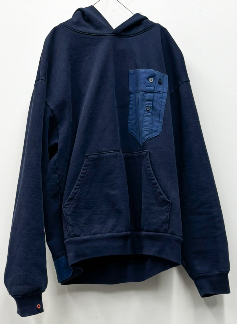 Navy hoodie with upcycled shirt cuff as the front pocket and shirt detailing on the back